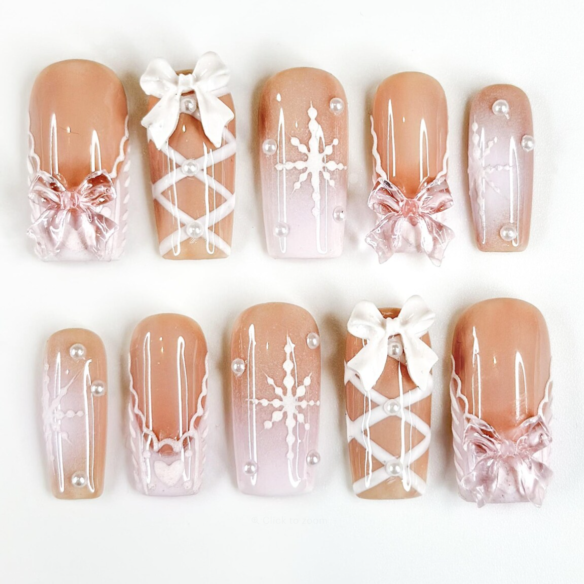 The Pink Ribbon press on nails combine soft pink lace details with 3D bow and pearl nail art, creating a charming winter manicure. Perfect for girly Christmas nails, elegant holiday looks, and soft pink nail trends. These festive press-ons offer a classy, feminine aesthetic for winter celebrations and everyday wear.