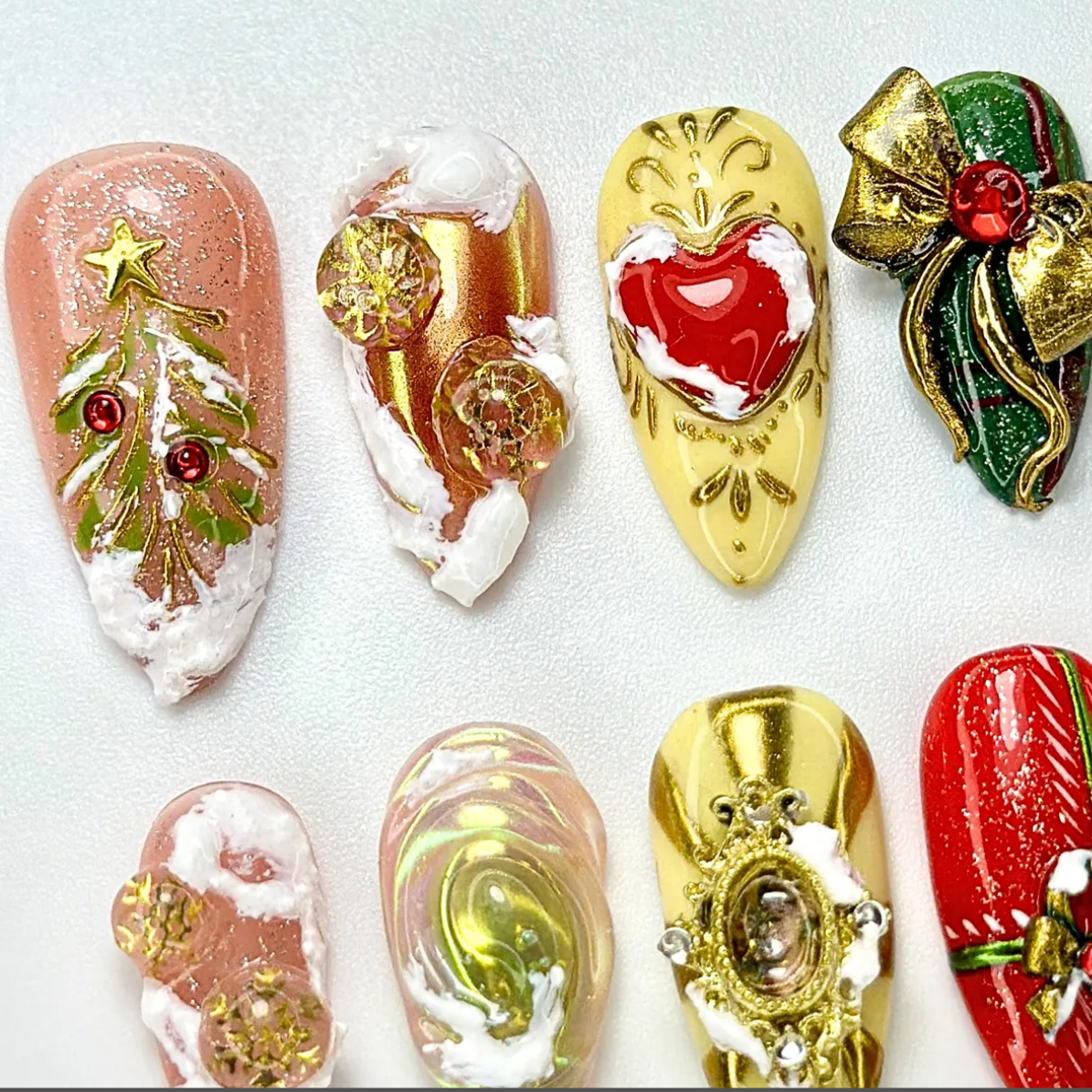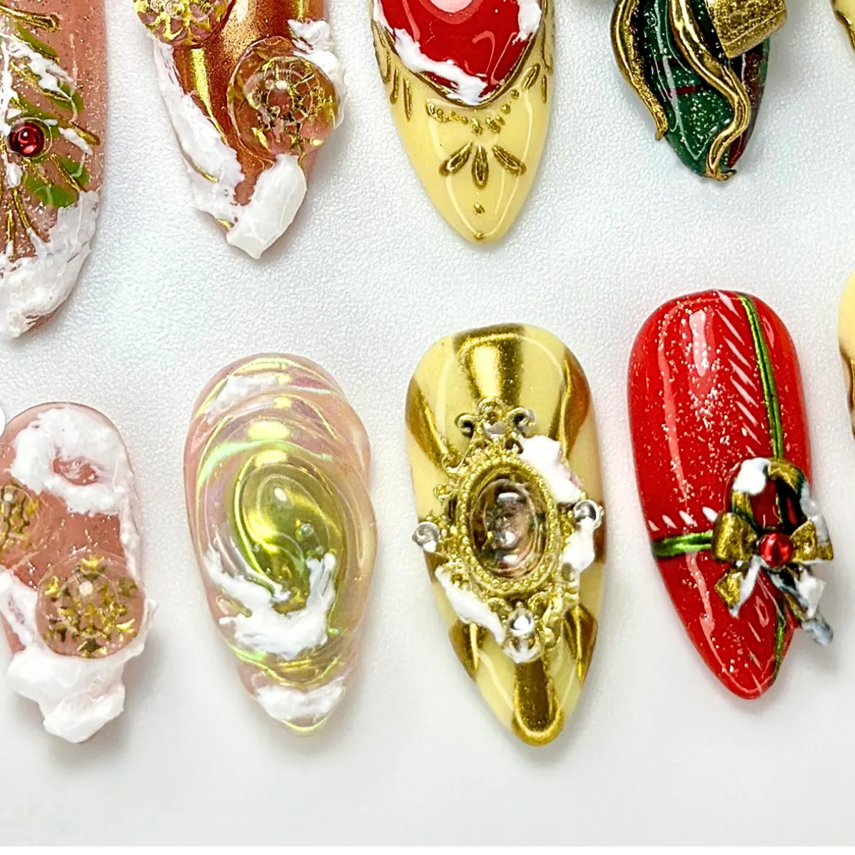 Royal Baroque press on nails combine red and gold tones with luxury 3D ribbon nail art for the ultimate Christmas manicure. These elegant holiday nails offer a royal aesthetic, perfect for Christmas parties, luxury nail art lovers, and glamorous winter manicures. Reusable, long-lasting, and ultra-stylish.