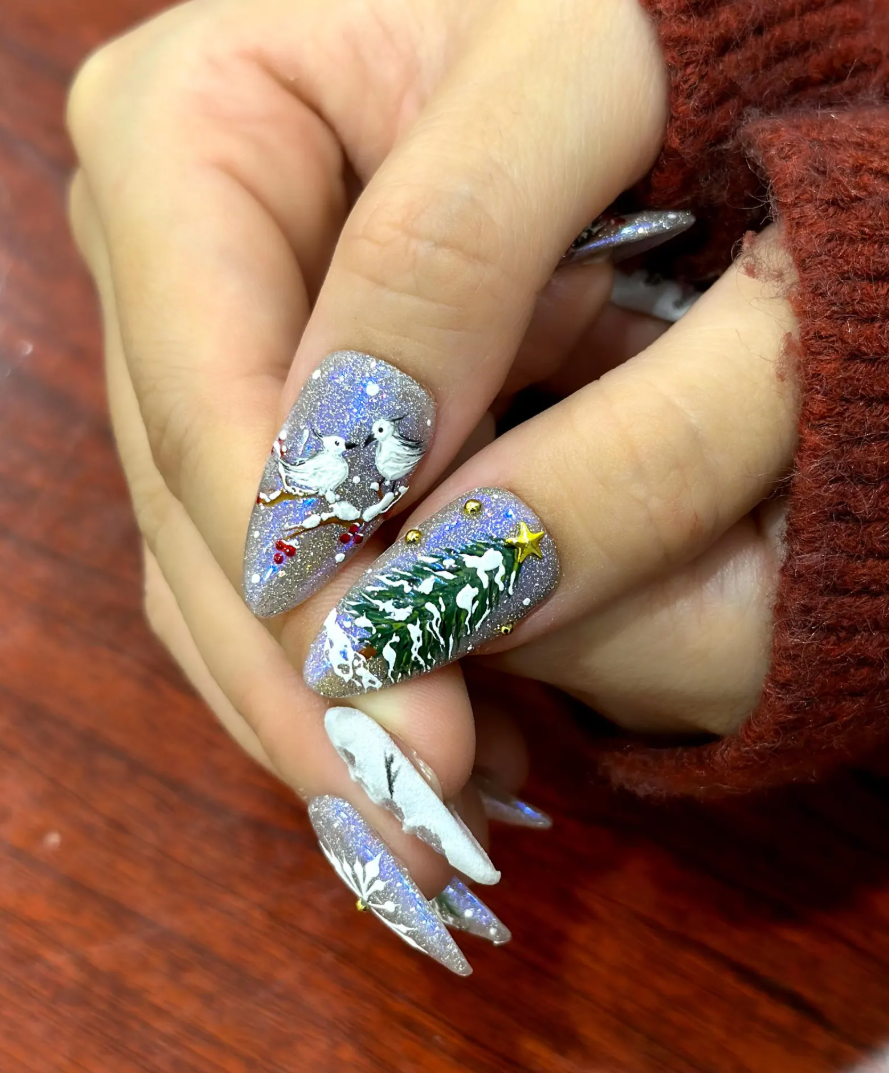 Silver Frost press on nails showcase 3D snowman nail art, Christmas tree accents, frosted birds, and a magical winter scene. These Christmas press on nails deliver festive sparkle with long-lasting wear. Perfect for holiday nail art lovers seeking elegant winter nails, glossy designs, and easy reusable fake nails.