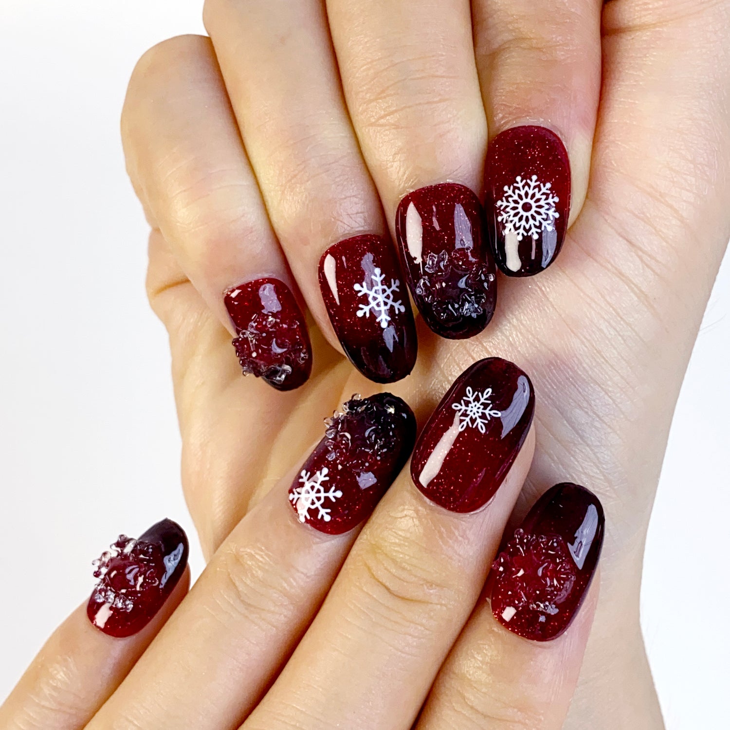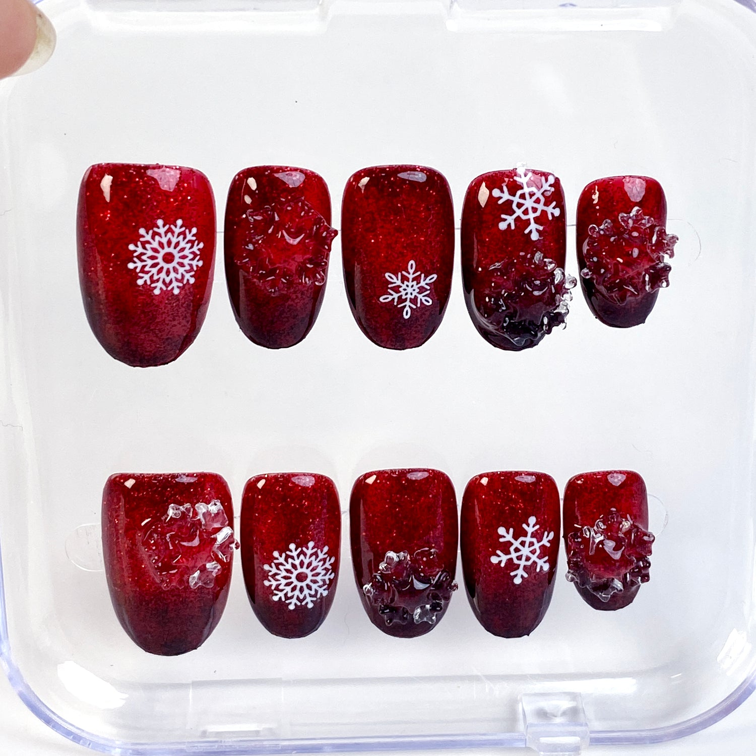 Celebrate the holiday season with Frosted Glow Christmas press on nails. Designed with a stunning red-to-black gradient, glittery snowflakes, and festive winter vibes, this handmade nail set makes the perfect Christmas party nails. Durable, reusable, and easy to apply, they’re a must-have for winter nail art lovers.