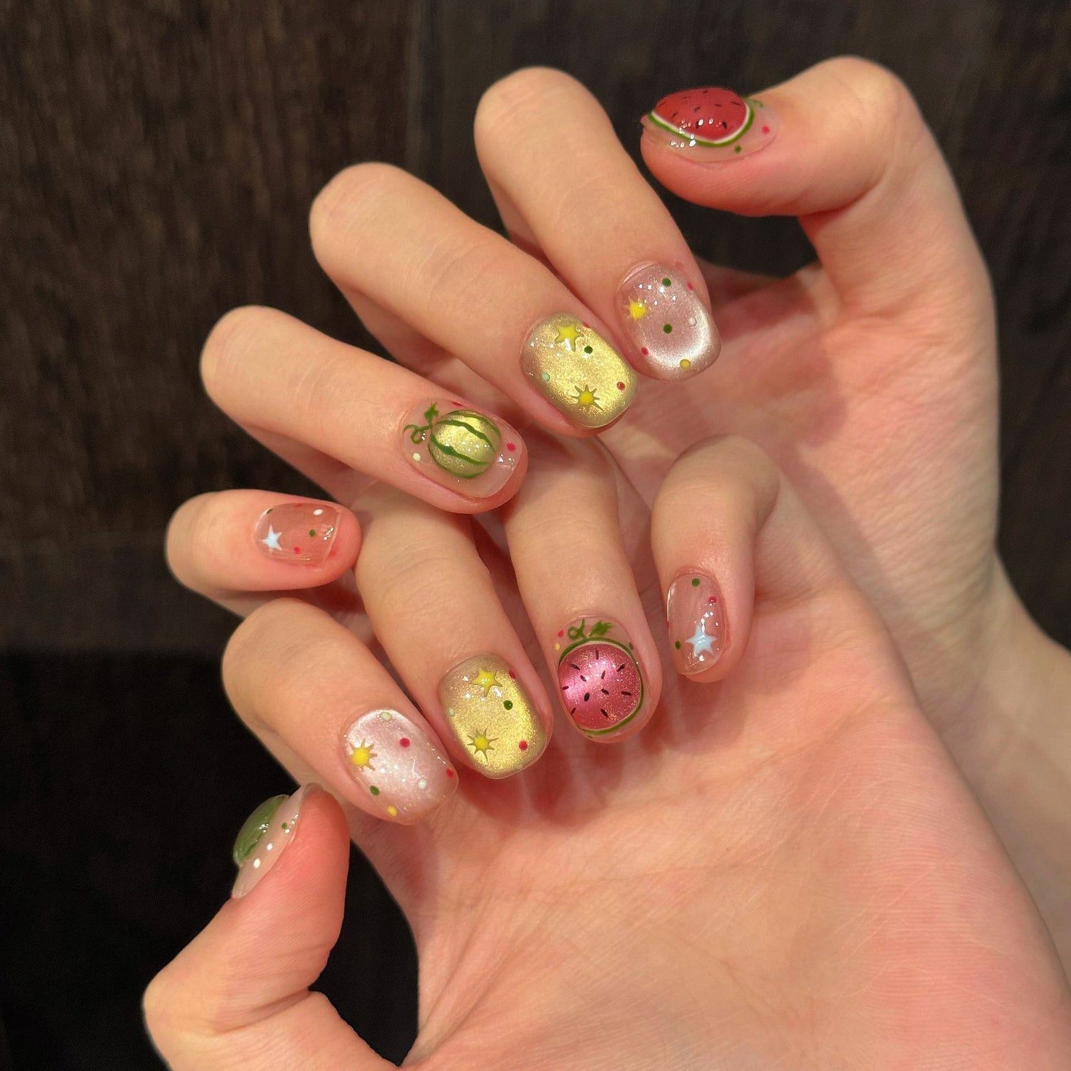 Step into playful summer vibes with Sweet Bite press-on nails. Designed with hand-painted watermelon details and shimmering cat-eye effects, each nail radiates cuteness and fun. The lively colors capture the freshness of juicy fruit, making it a cheerful statement piece for any sunny day or casual outing.