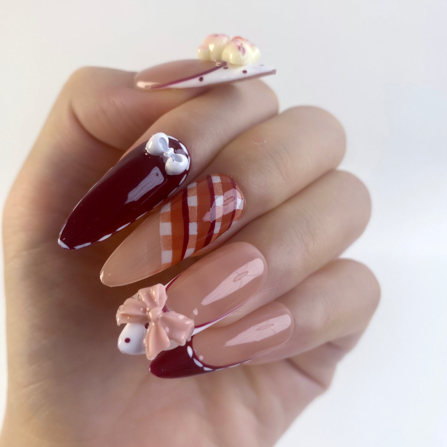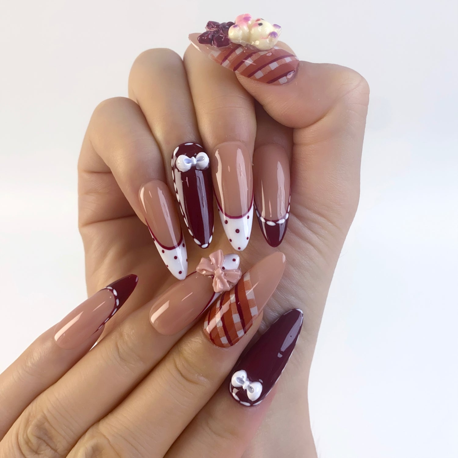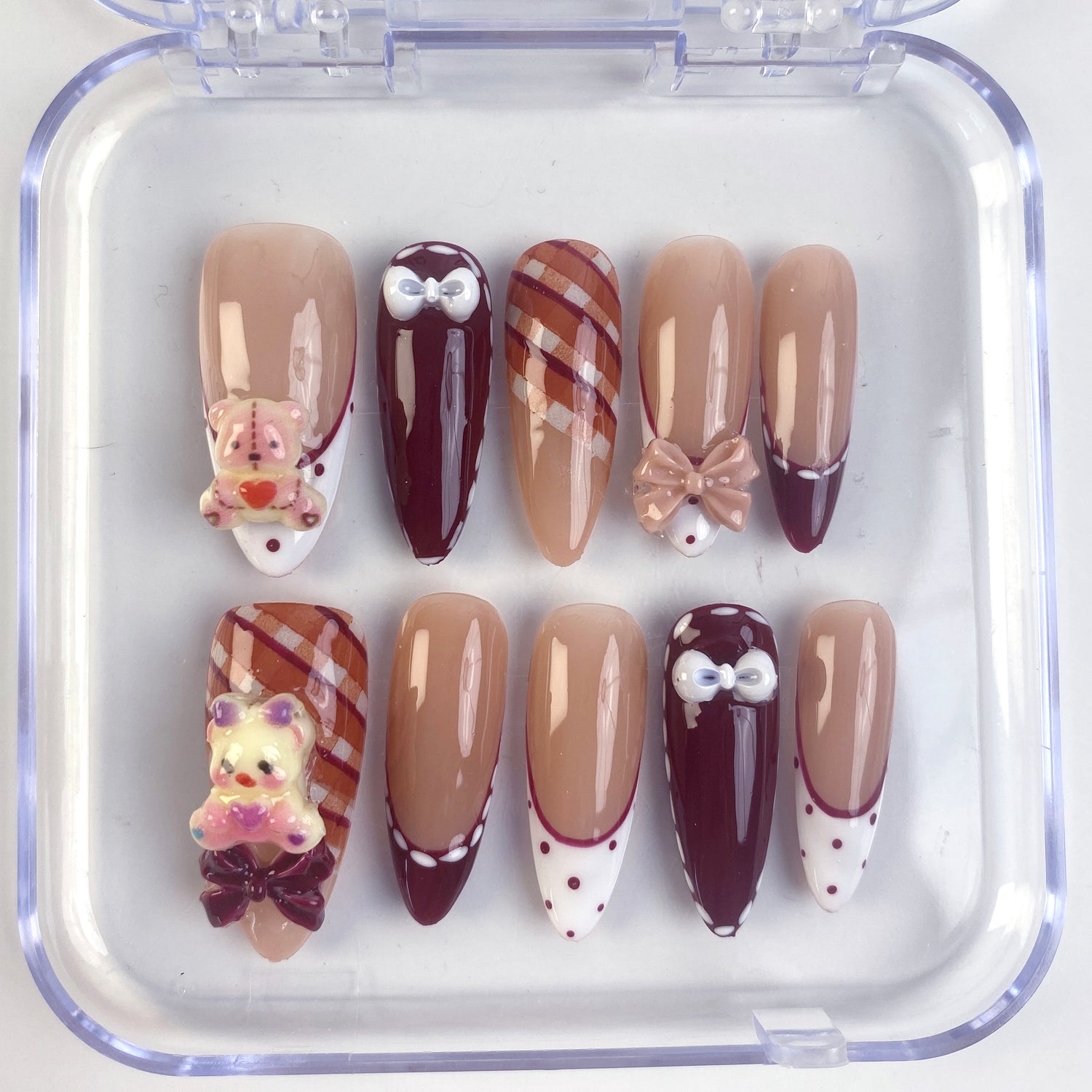 Step into cozy sweetness with Teddy Bow handmade press on nails. Featuring 3D teddy bear accents, delicate bows, and chic French tip nail art, this design is perfect for autumn and winter manicures. Cute and stylish, these reusable fake nails are ideal for teddy bear nails, kawaii nail art, or cozy holiday looks.