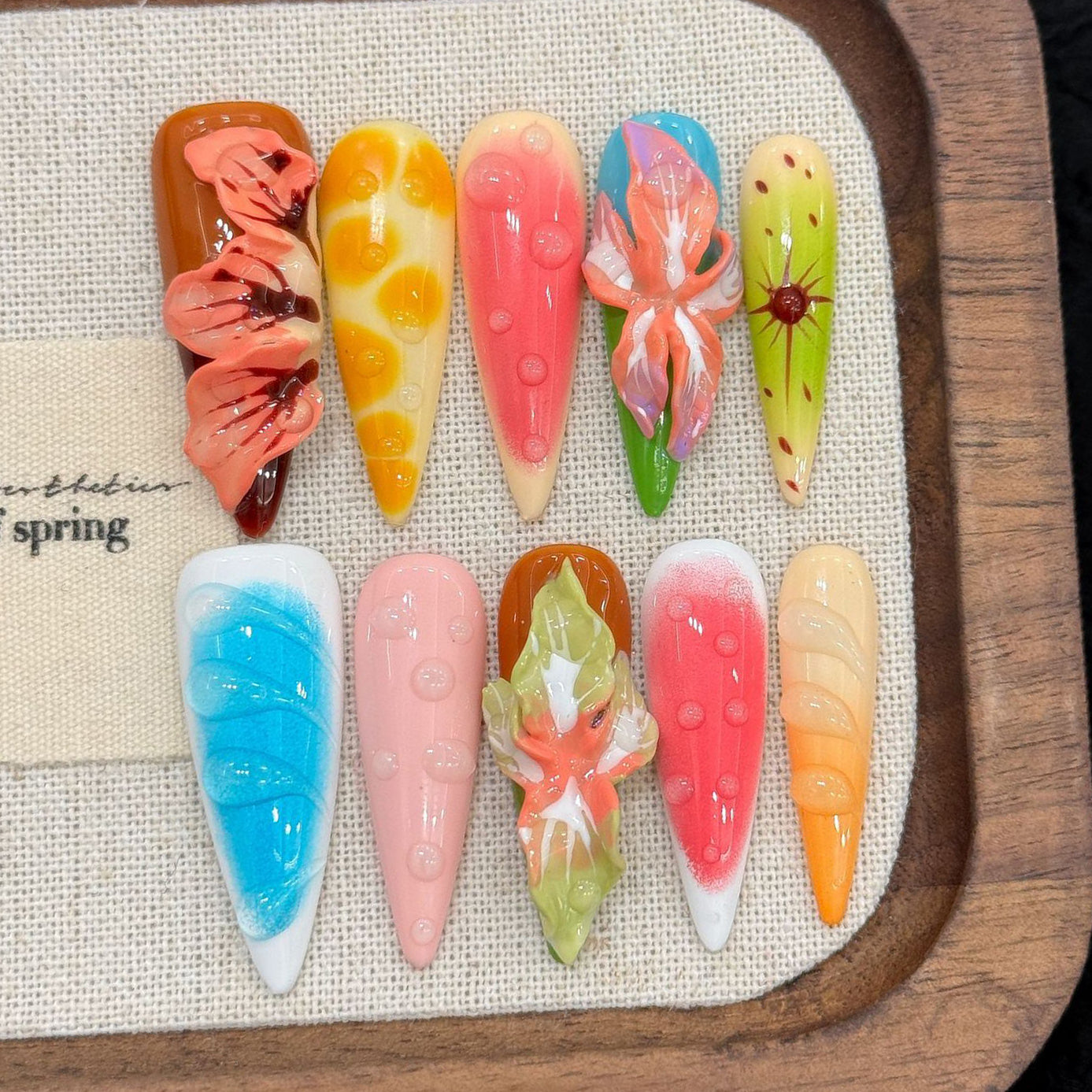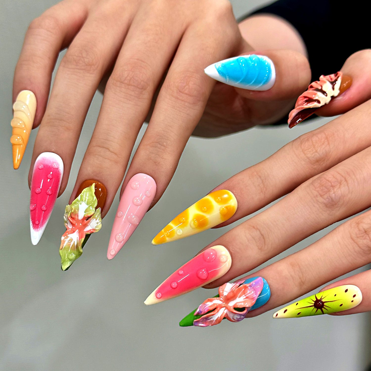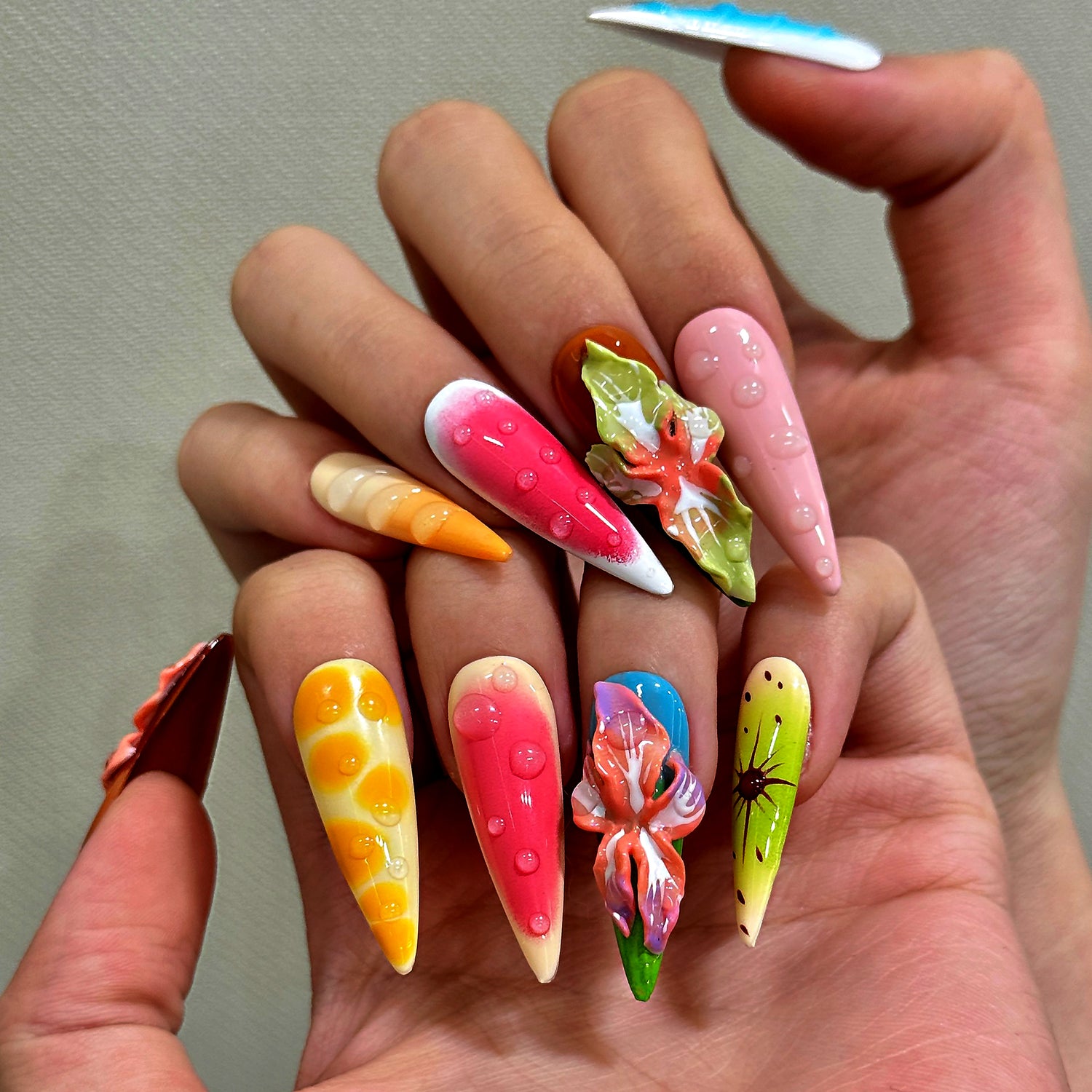 Energize your nails with the Dopamine Bloom press-on set from Ersa Nails. Bursting with vibrant tropical florals and vivid 3D details, this colorful design radiates joyful summer vibes. Perfect for adding a playful, uplifting touch to your look any day of the season.