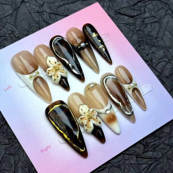 Embrace sophisticated style with Metallic Bloom press-on nails from Glowyshe. Featuring a cozy autumn-winter gray-brown base accented with 3D white floral details and metallic round frames, these reusable nails create a chic, textured look. Perfect for fall nails, winter nail art, 3D nails, floral press-ons, and salon-quality manicure at home, ideal for elegant, fashion-forward occasions.