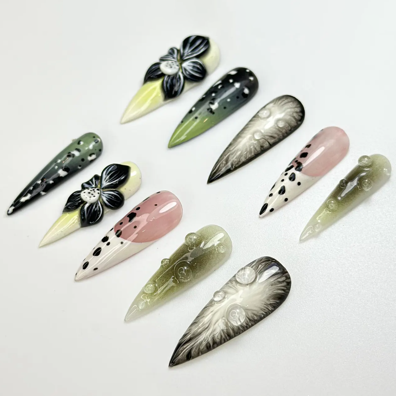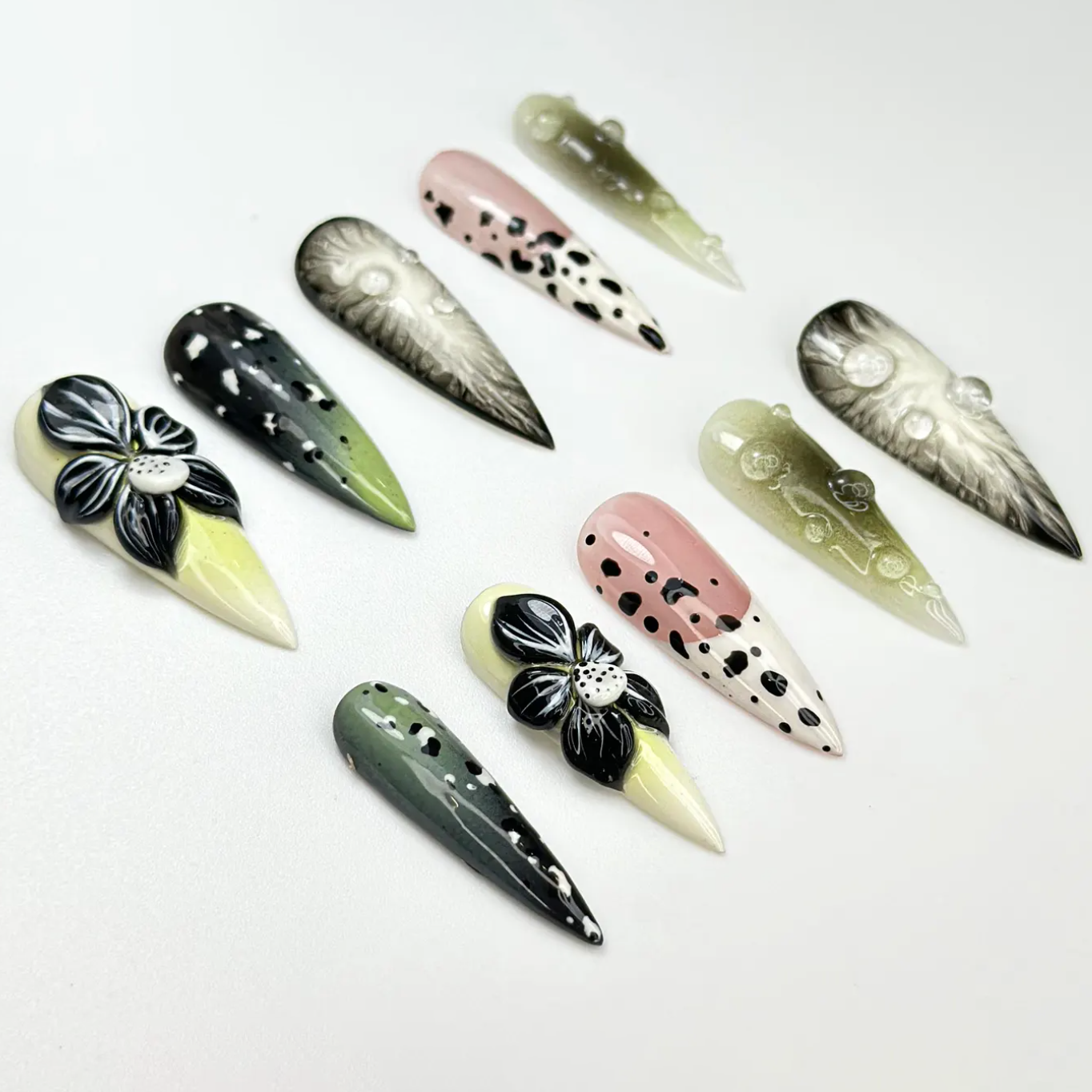 Discover nature’s elegance with these Elegant Green Bloom Press On Nails. Featuring 3D black and white florals, soft green ombre, and dotted accents, this hand-painted nail art set captures natural beauty. Perfect for spring or fall looks, it’s a must-have for floral and nature-inspired nail lovers.