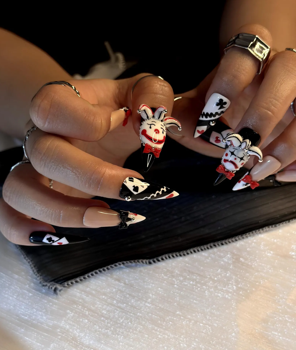 Step into spooky elegance with these Harlequin Gothic Press On Nails. Featuring black, white, and red tones with 3D clown accents, these handmade stiletto nails bring dramatic flair to your Halloween look. Perfect for gothic lovers seeking bold, luxury nail art inspired by the joker and playing cards.