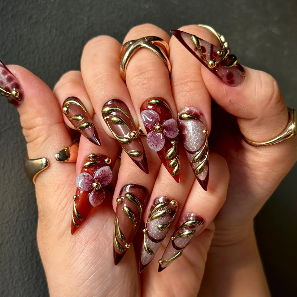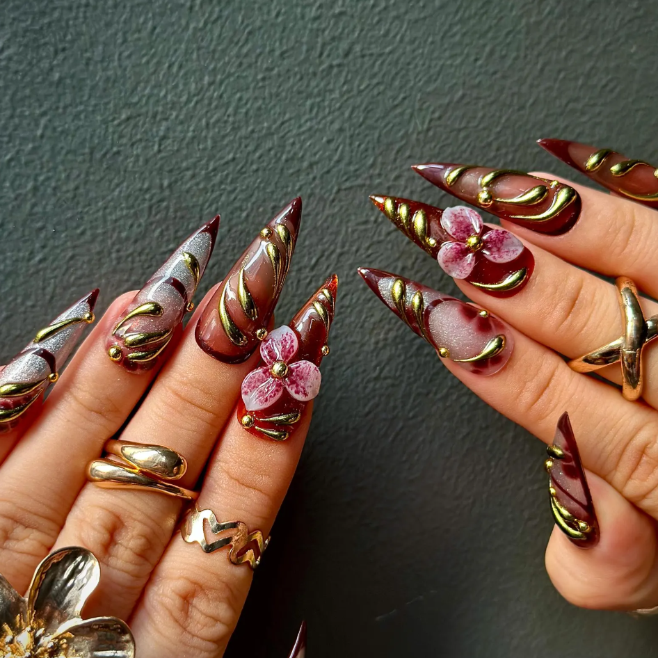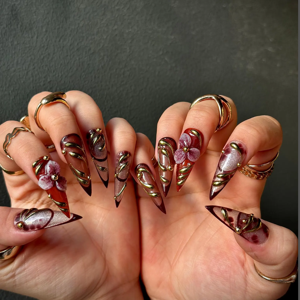 Add a touch of sophistication with these Fall Orchid Press On Nails. The rich burgundy base and detailed floral art create a perfect autumn look. Handmade with care, these long stiletto nails blend luxury, femininity, and timeless elegance — ideal for daily wear, parties, or special events.