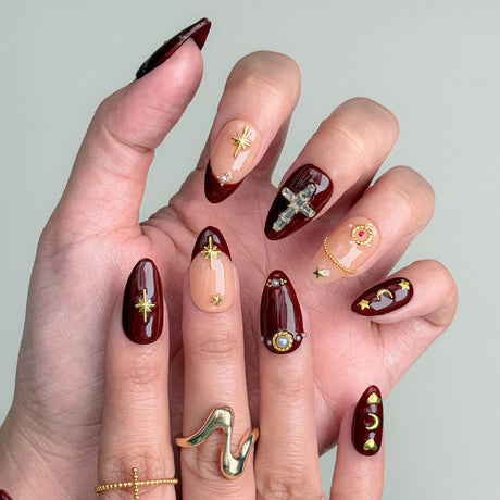 Punk Wings press-on nails exude dark vintage charm. Metallic butterflies and edgy details sit atop a deep-toned base, blending gothic romance with punk-rock flair. A statement design for fearless fashionistas.