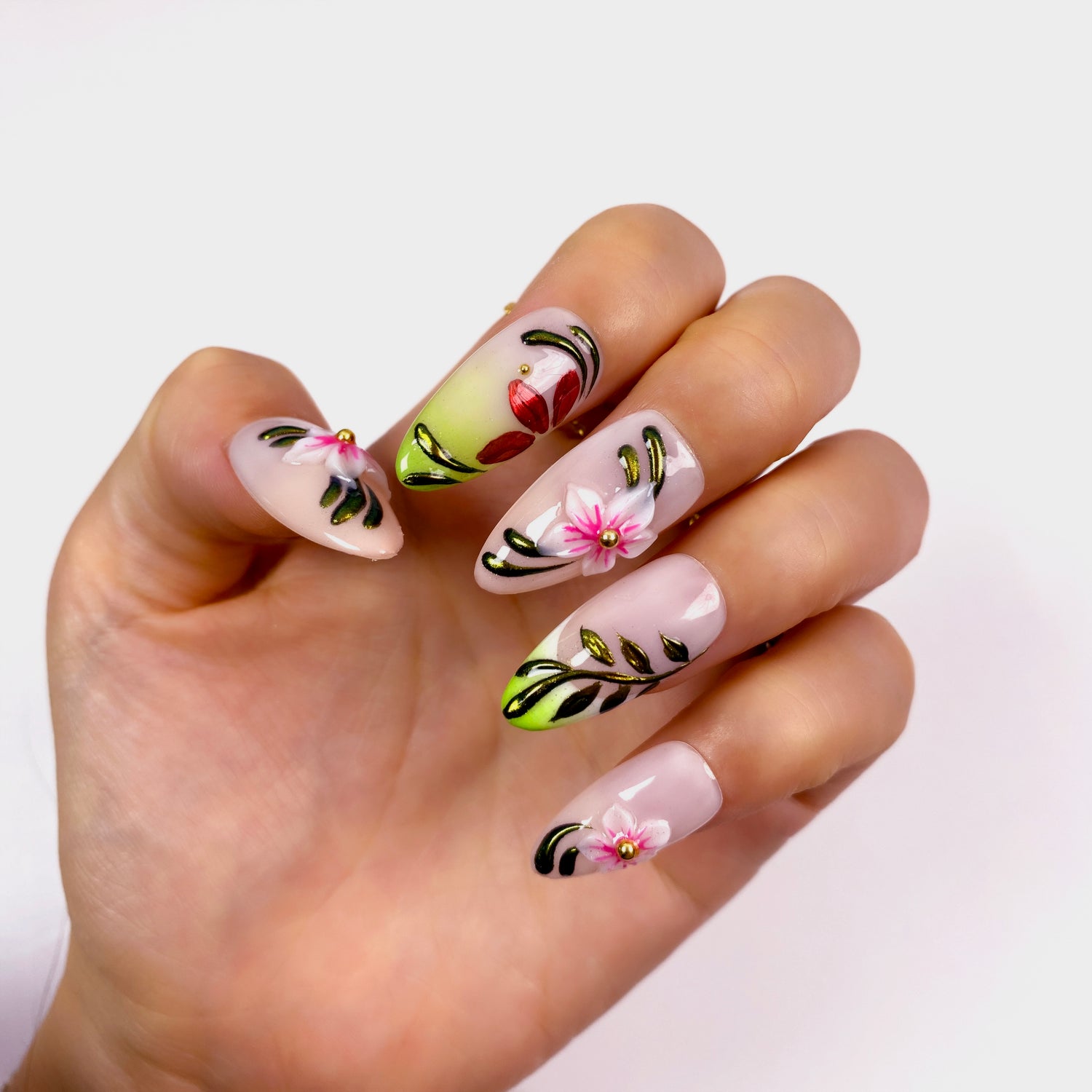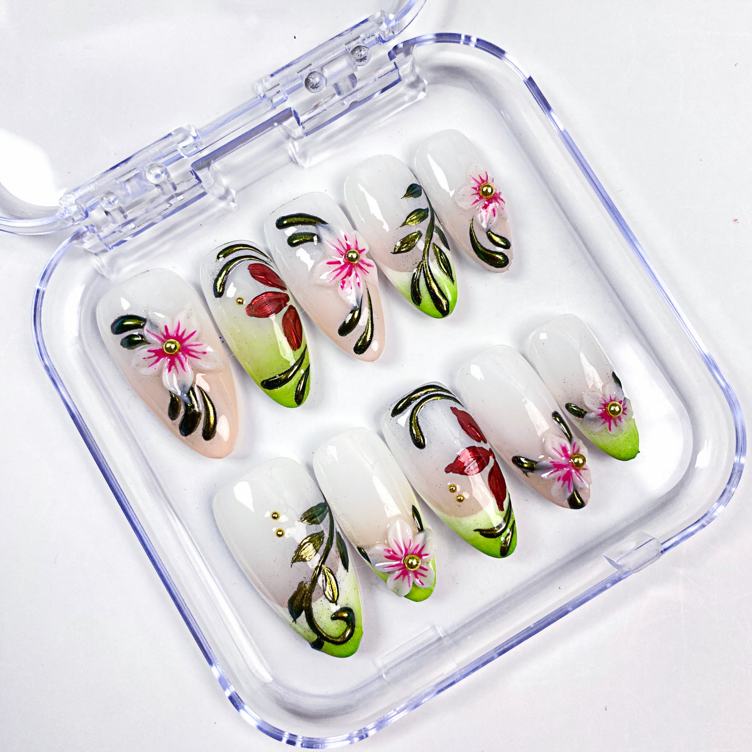 Bold and enchanting, Scarlet Vine features vivid red 3D florals accented with green metallic vines and subtle golden touches. This handcrafted set captures the spirit of a blooming garden with dramatic flair. It’s the perfect design for turning heads at special events or making everyday a little more magical.