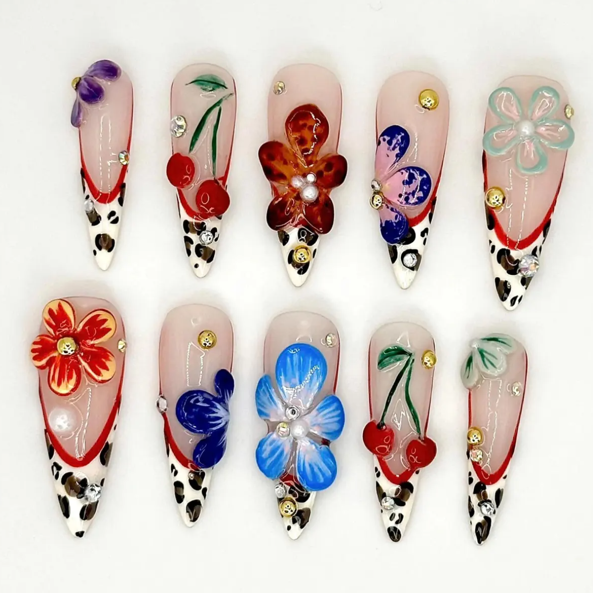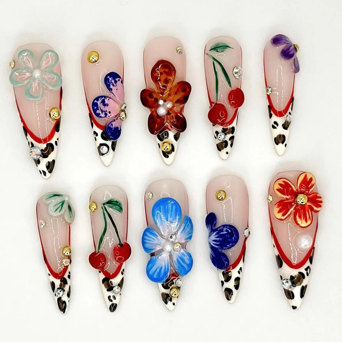 Add a bold touch to your fall manicure with these leopard French tip fake nails. Featuring cherry blossom accents and 3D floral nail art, this colorful set combines animal print with delicate blossoms. Perfect for DIY manicures, these reusable false nails offer salon-quality autumn style that’s easy to apply and long-lasting.