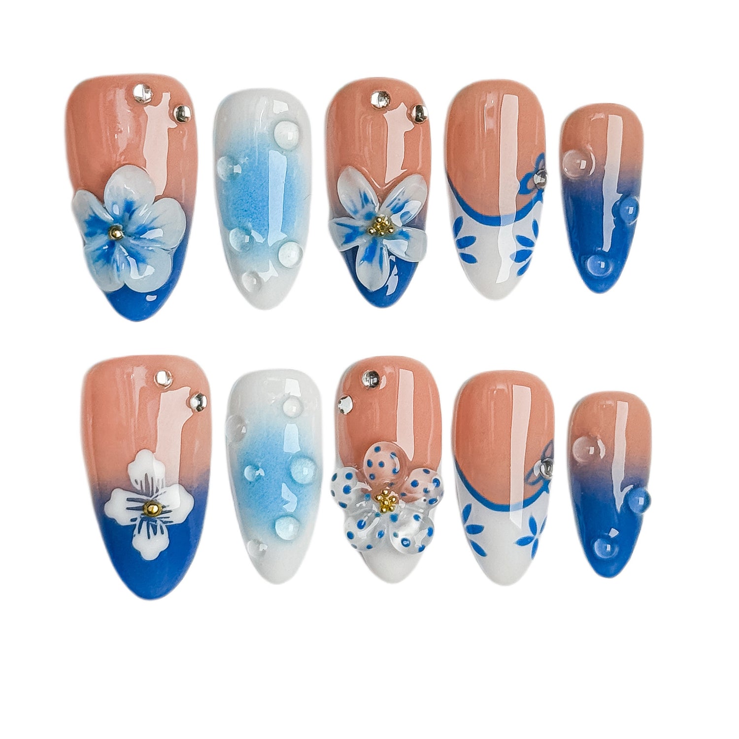 Embrace fresh elegance with Azure Bloom press-on nails from Glowyshe. Featuring a soft nude base with refined blue French tips, this set is enhanced with delicate 3D floral accents for a chic and romantic look. The medium almond shape adds timeless sophistication, perfect for both everyday wear and special occasions.