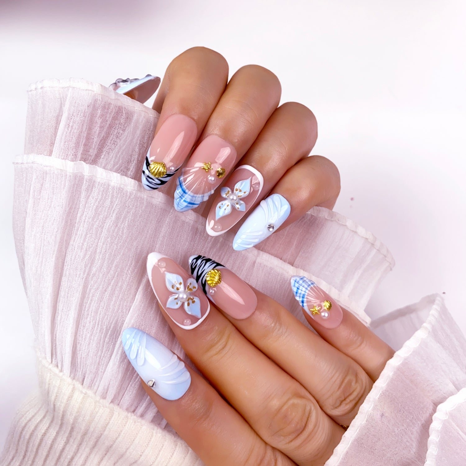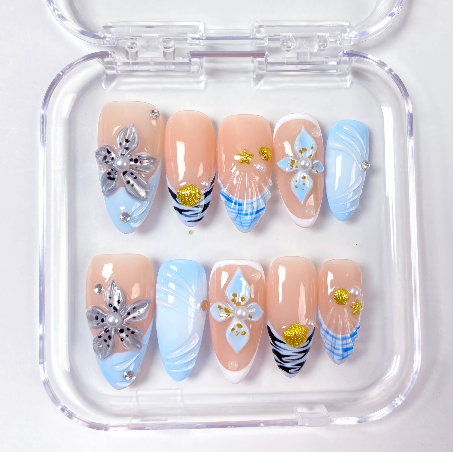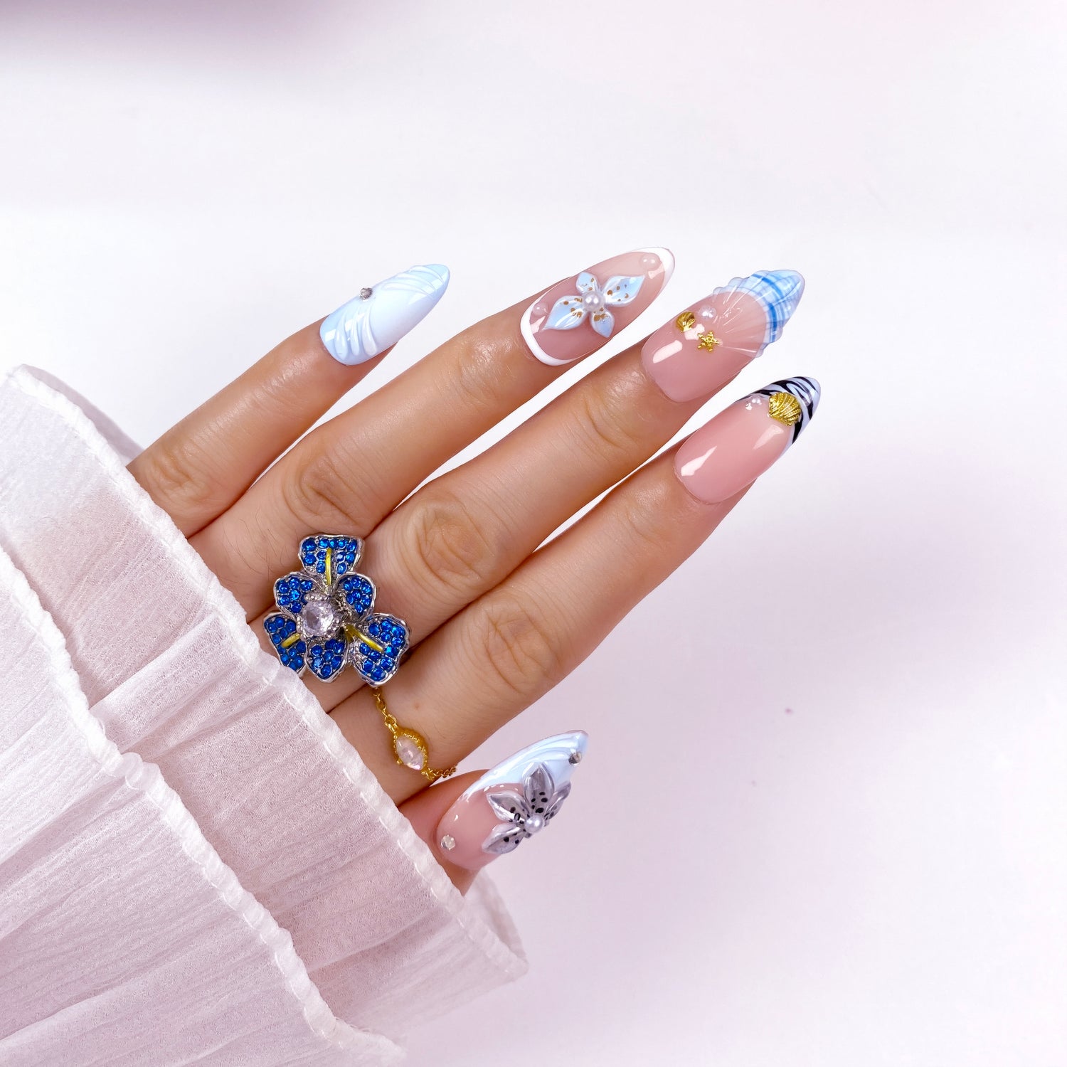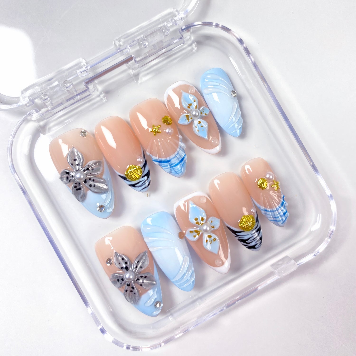 Embrace the tranquil charm of Blue Coast press-on nails. Inspired by ocean waves, these nails feature soft blue hues and shell-patterned textures. Delicate silver flowers and subtle glitter accents create a breezy, beach-ready vibe that’s both fresh and elegant.