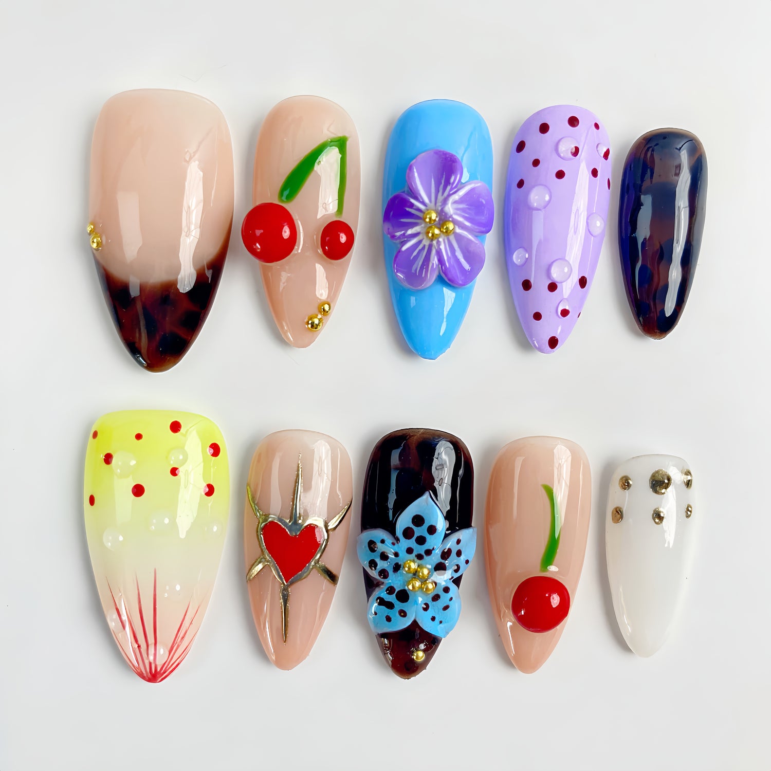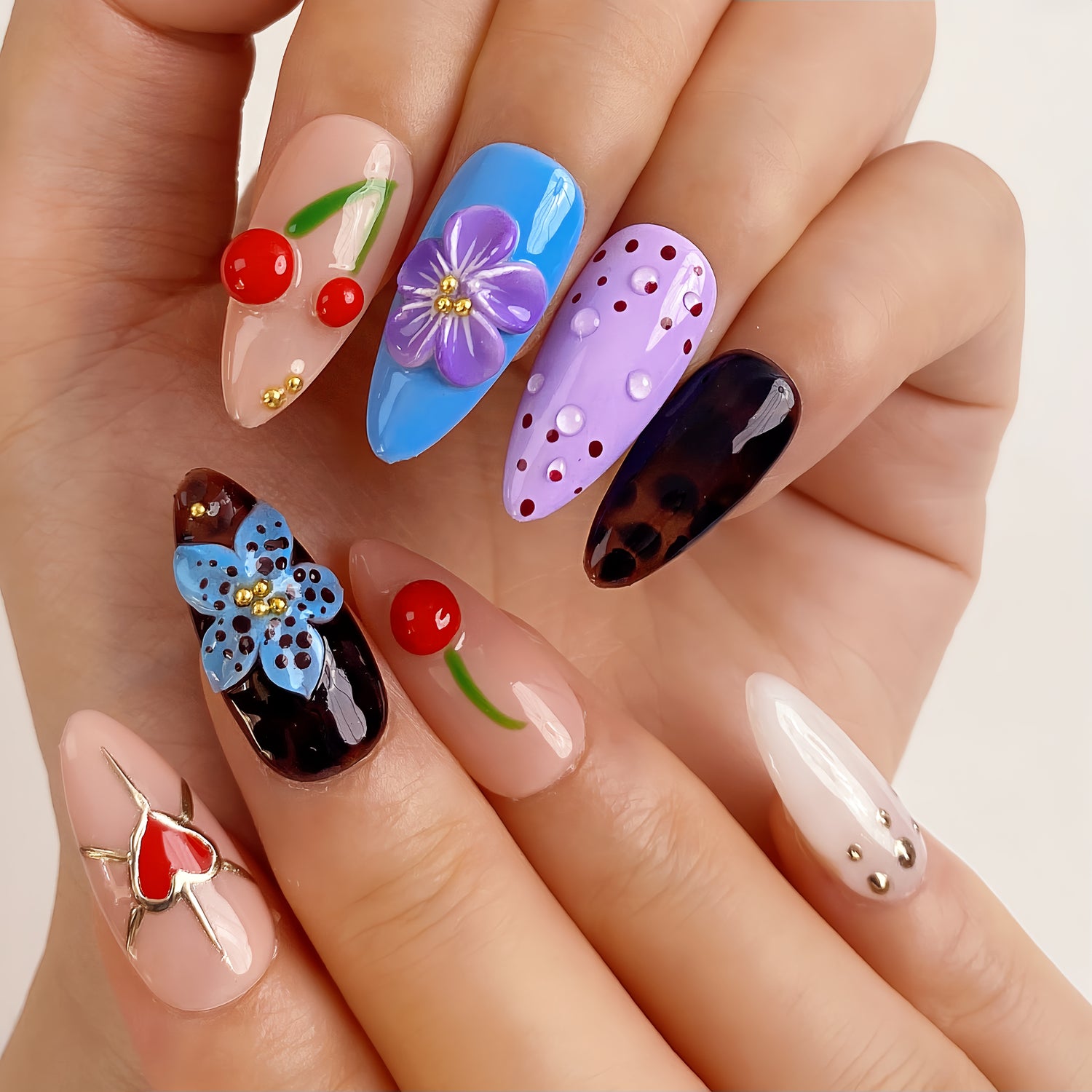 Immerse yourself in the playful charm of Cherry Bloom press-on nails from Ersa Nails. Featuring a nude base adorned with vibrant 3D flowers and delicate cherry accents, this design combines sweetness with elegance. The medium almond shape flatters every hand, while the colorful details add a fresh, joyful vibe. Perfect for brightening any occasion.
