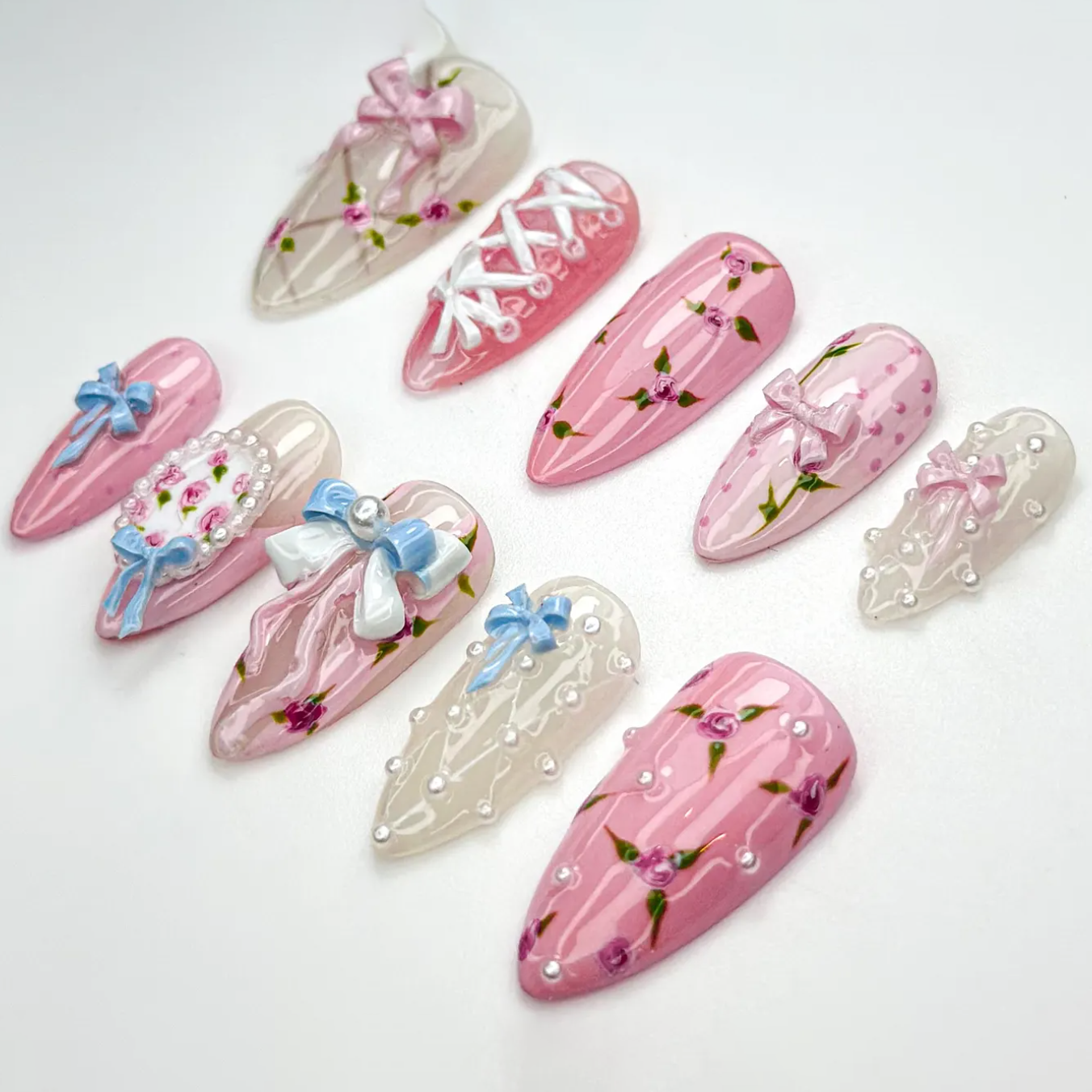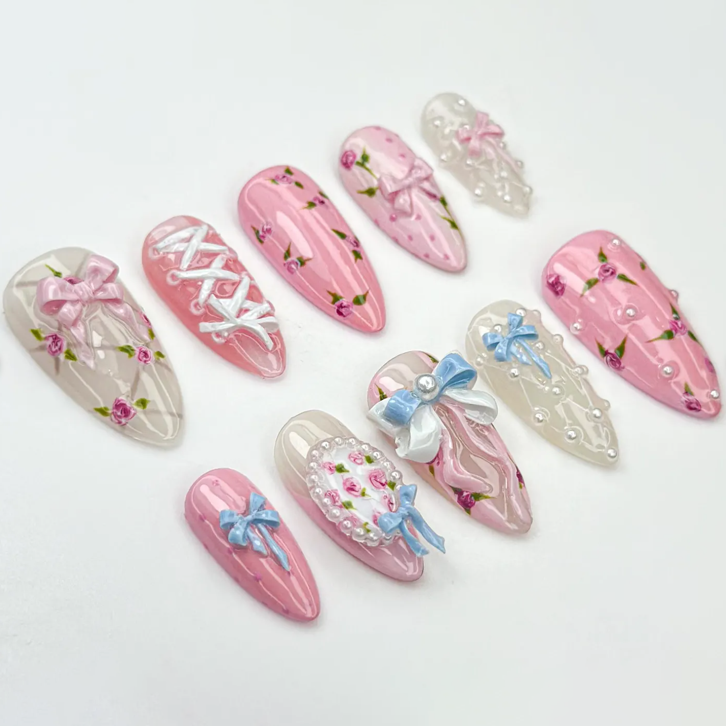 Step into timeless beauty with these Coquette Ballerina Press On Nails. Featuring rococo bows, vintage roses, and delicate pearls, this handmade 3D nail set exudes soft girl charm. Perfect for romantic dates or elegant parties, these nails bring luxury, femininity, and a touch of vintage floral glamour to your look.
