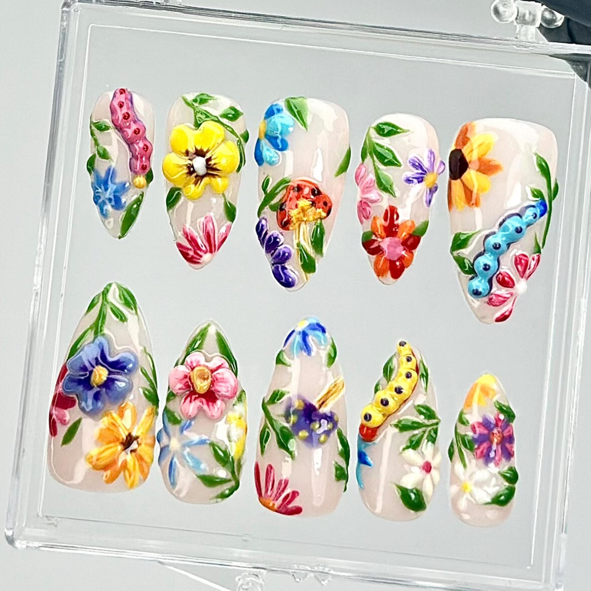 Step into spring with our Floral Garden Press On Nails by HudiNails. Hand-painted with 3D colorful flowers, these botanical-inspired fake nails bring fresh, natural beauty to your look. Perfect for spring outfits, weddings, or daily wear. Easy to apply, reusable, and crafted for long-lasting elegance and charm.