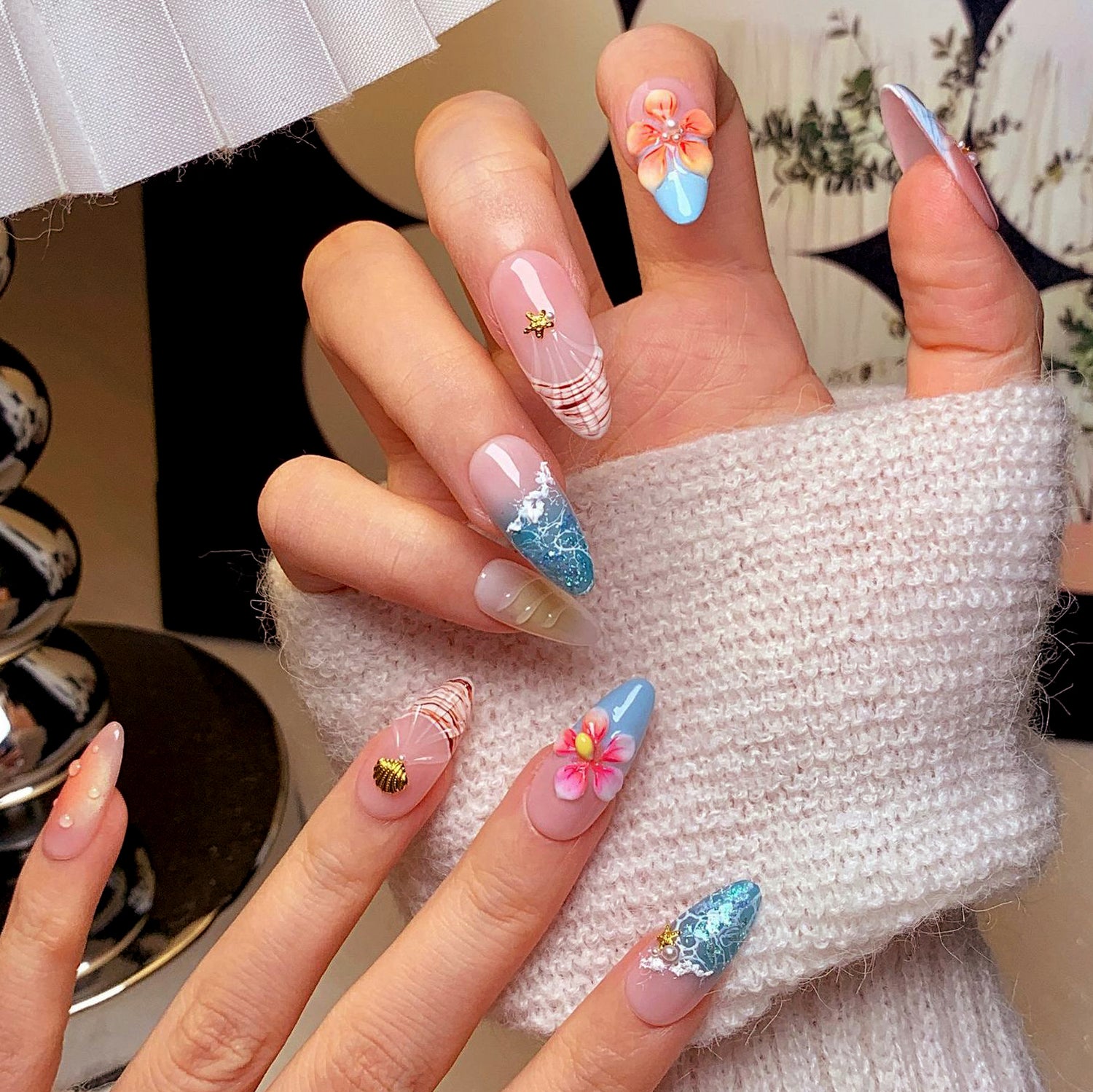 Dive into coastal beauty with Ocean Bloom press-on nails from Glowyshe. Featuring a refreshing ocean-wave design paired with intricate 3D floral accents, this set captures the essence of beachside elegance. The medium almond shape blends natural charm with artistic detail, perfect for summer getaways, seaside vibes, or simply adding a breezy touch to your everyday style.