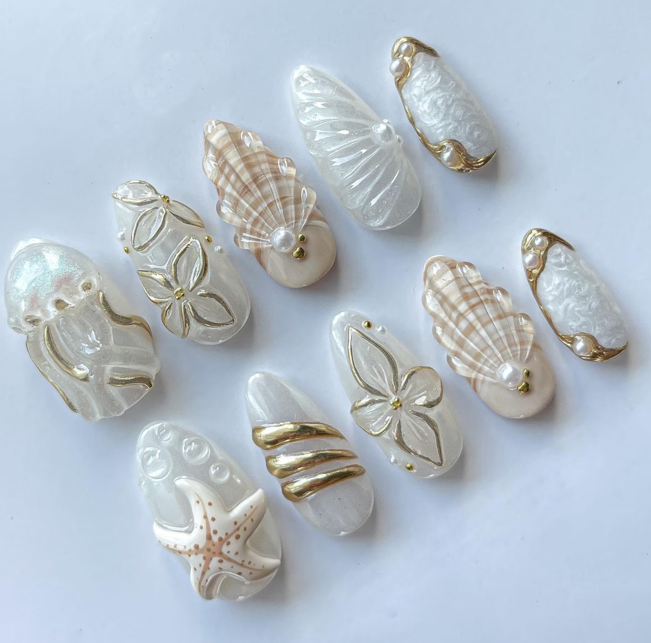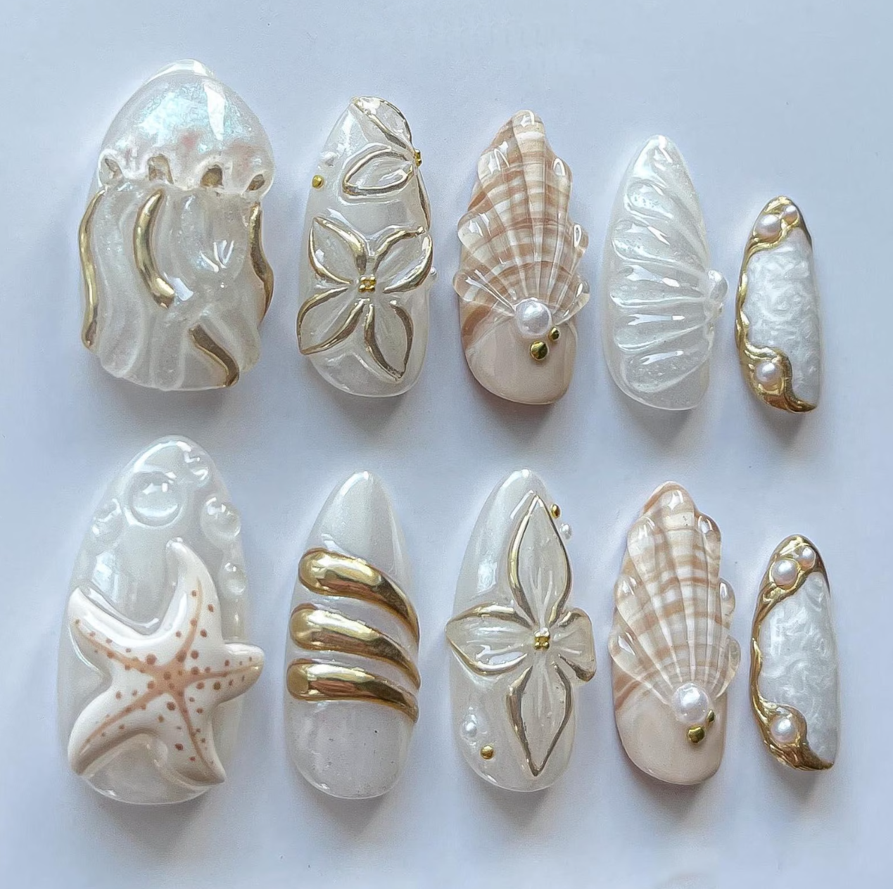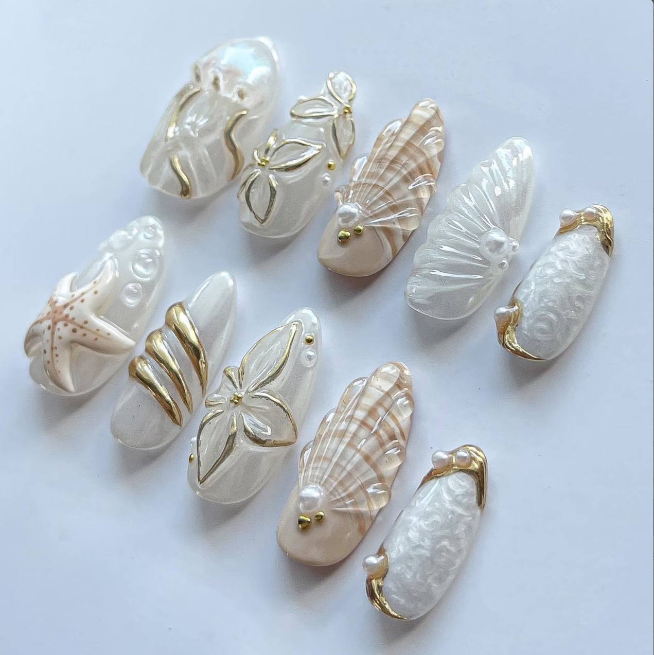 Dive into marine beauty with these Seashell Starfish Jellyfish Mermaid Press On Nails. Crafted with 3D white and gold details, these handmade reusable gel fake nails bring ocean fantasy to life. Perfect for summer nails, mermaid lovers, or custom beach-themed manicures.