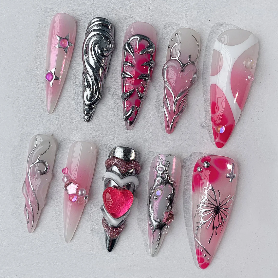 Fall in love with these Y2K-inspired Press On Nails featuring 3D pink hearts and butterfly charms. The glossy chrome finish and cute Valentine aesthetic add a fun, girly vibe. Perfect for romantic occasions or everyday glam, these handmade acrylic nails are the ultimate soft, dreamy style statement.