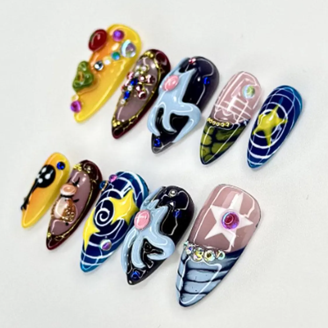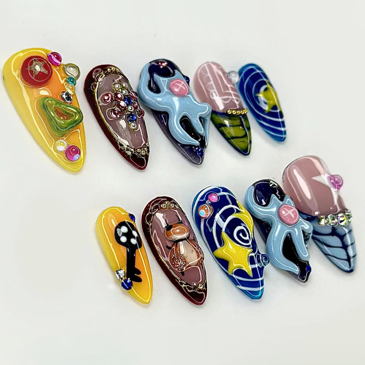 Add a playful twist with these 3D Cartoon press-on nails! Featuring cute cat and star designs in a vibrant Y2K aesthetic, these handmade nails bring nostalgic charm and personality to any look. Ideal for kawaii nail fans who love colorful, fun, and customizable nail art styles.